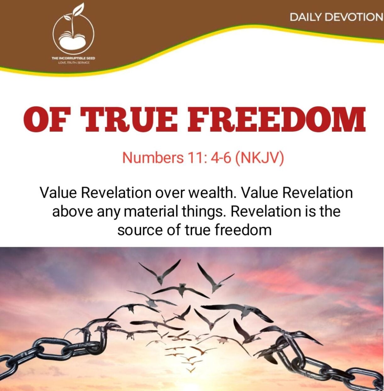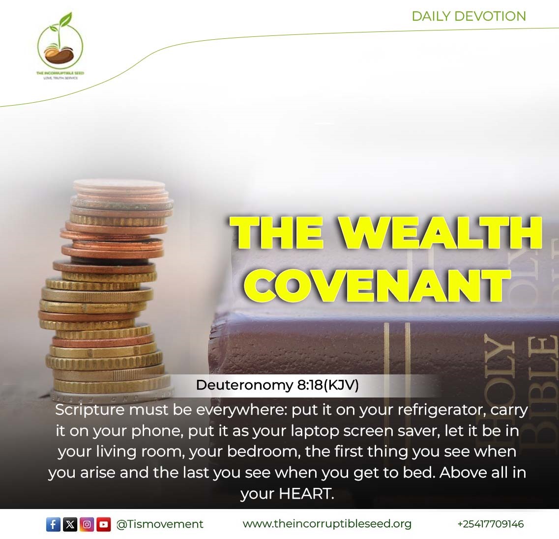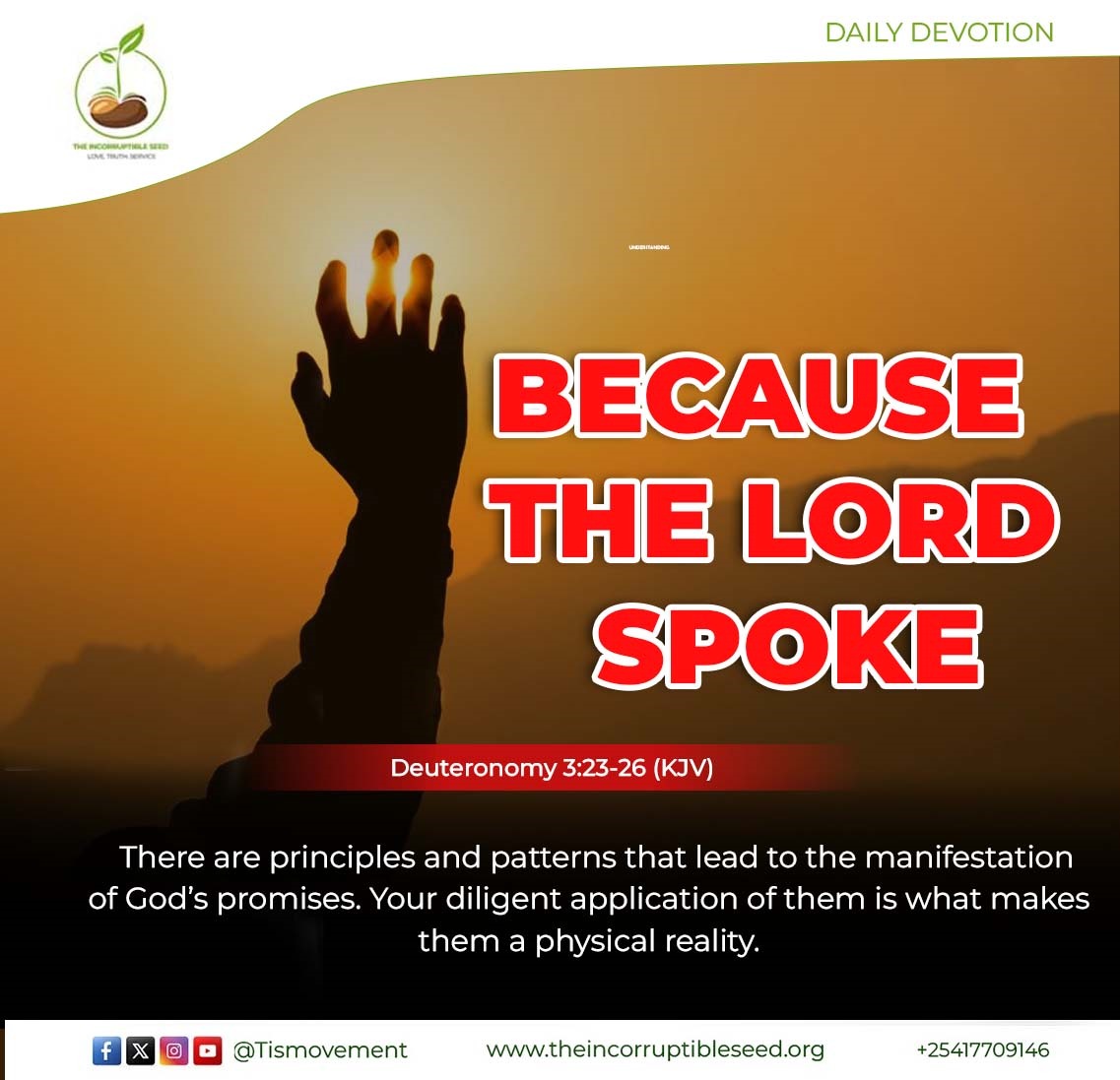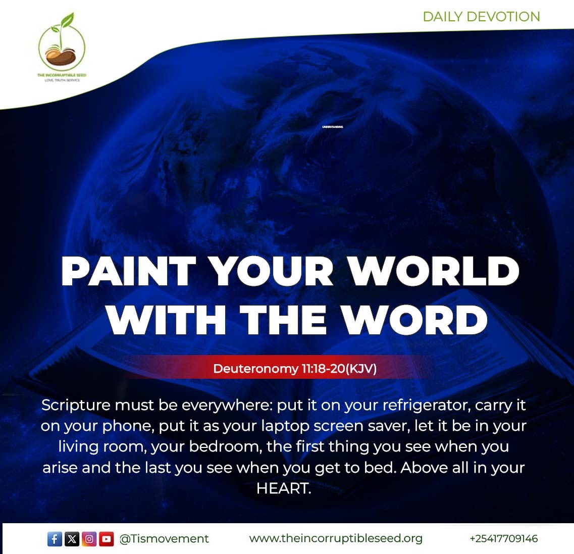 DAILY DEVOTION Today’s Bible Reading: Deuteronomy 16 – 20 PAINT YOUR WORLD WITH THE WORD Deuteronomy 11:18-20(KJV); Therefore shall ye lay up these my words in your heart and in your soul, and bind them for a sign upon your hand, that they may be as frontlets between your eyes. And ye shall teach them […]